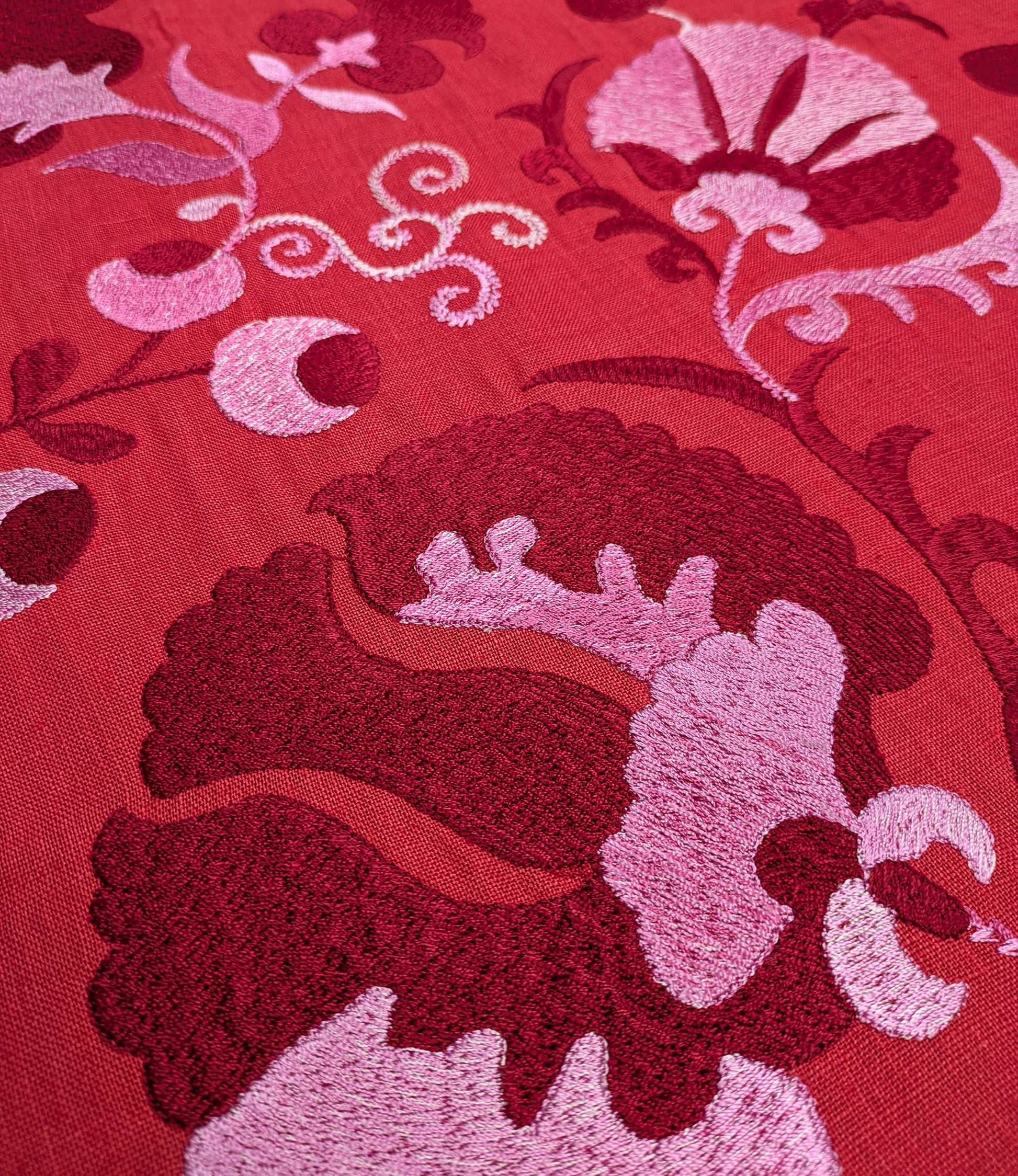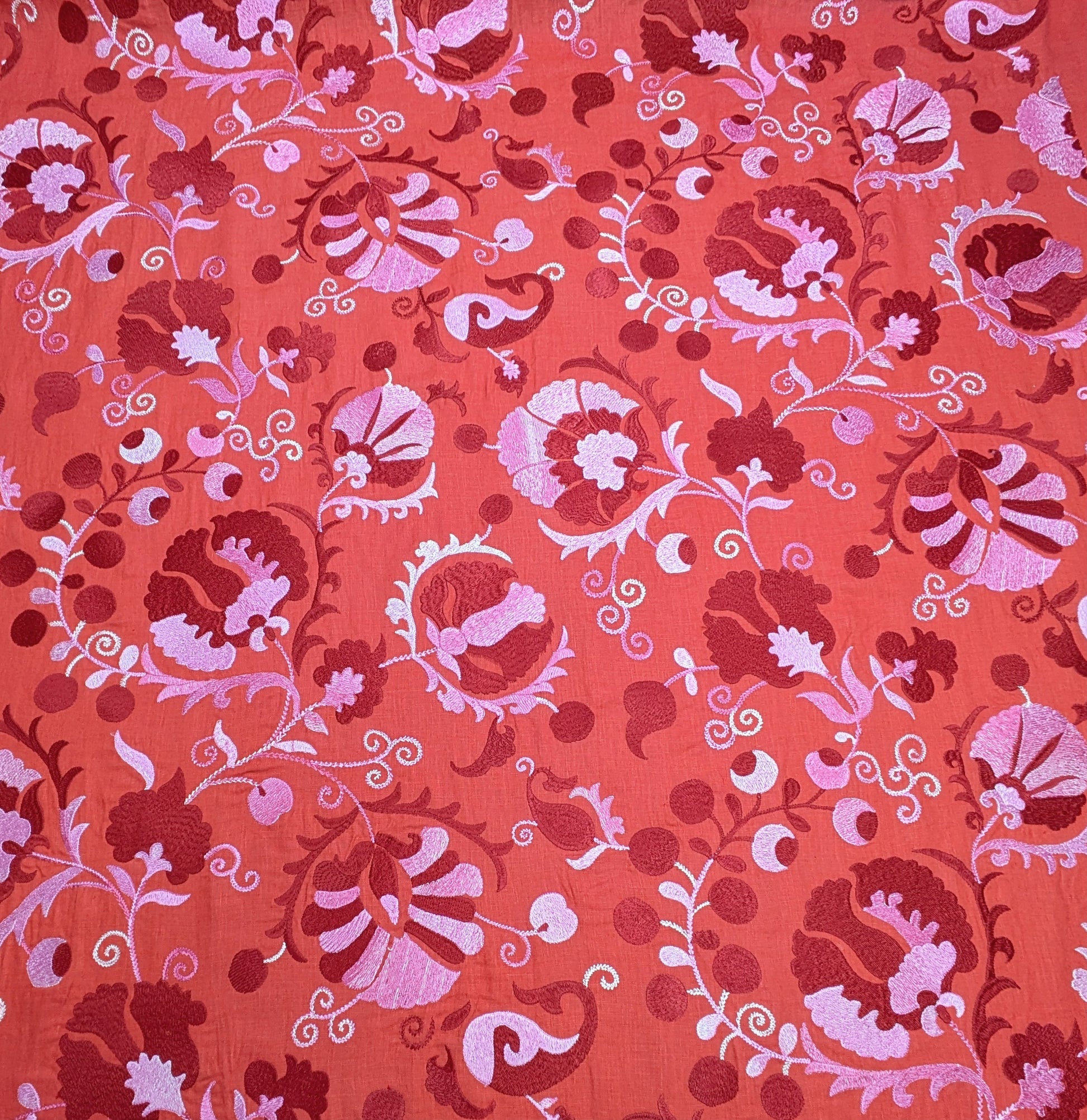 Inspired by a spectacular suzani from Afghanistan. The motifs are delicately embroidered on linen.