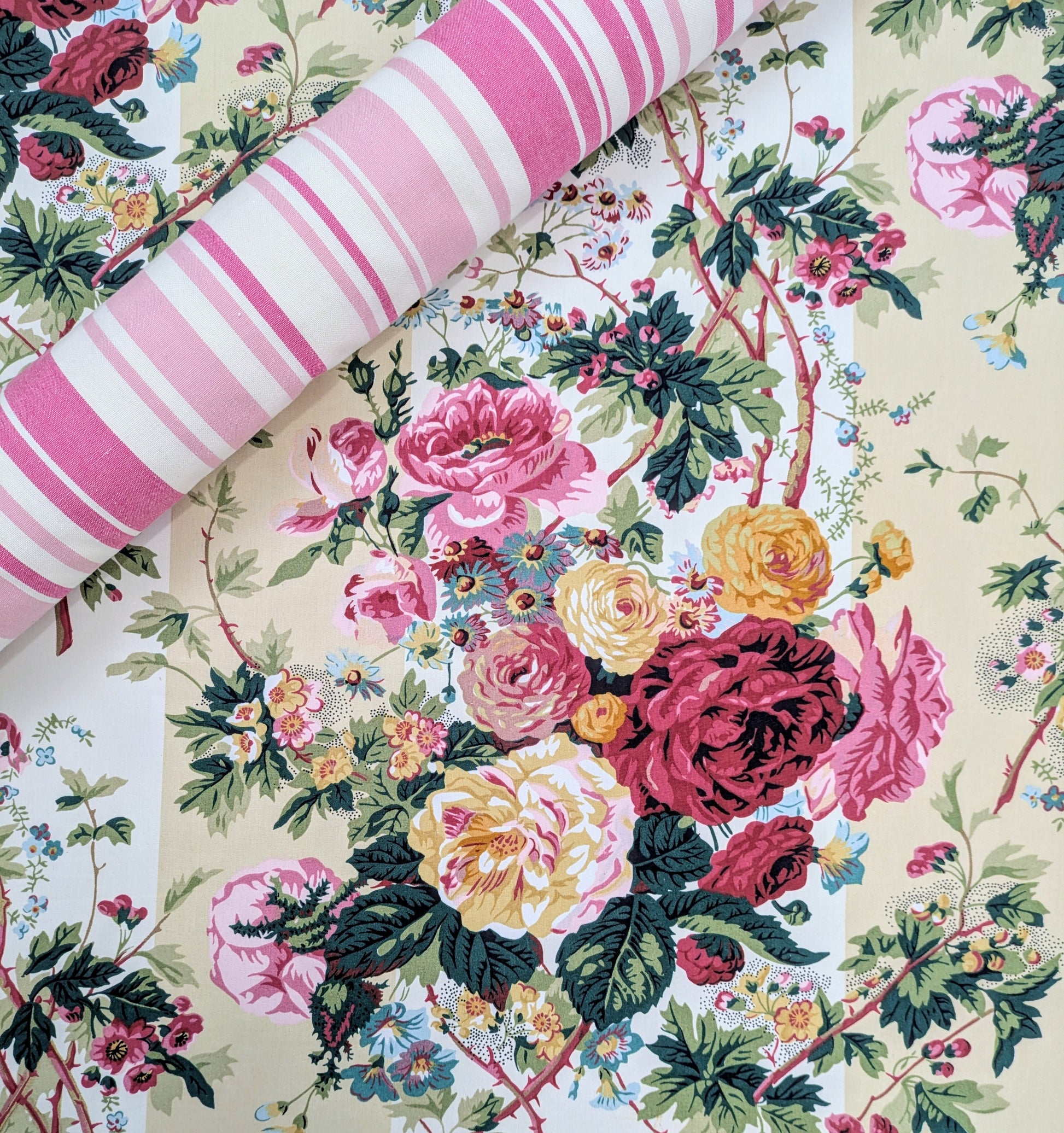 Large scale Chintz design of roses on a striped background